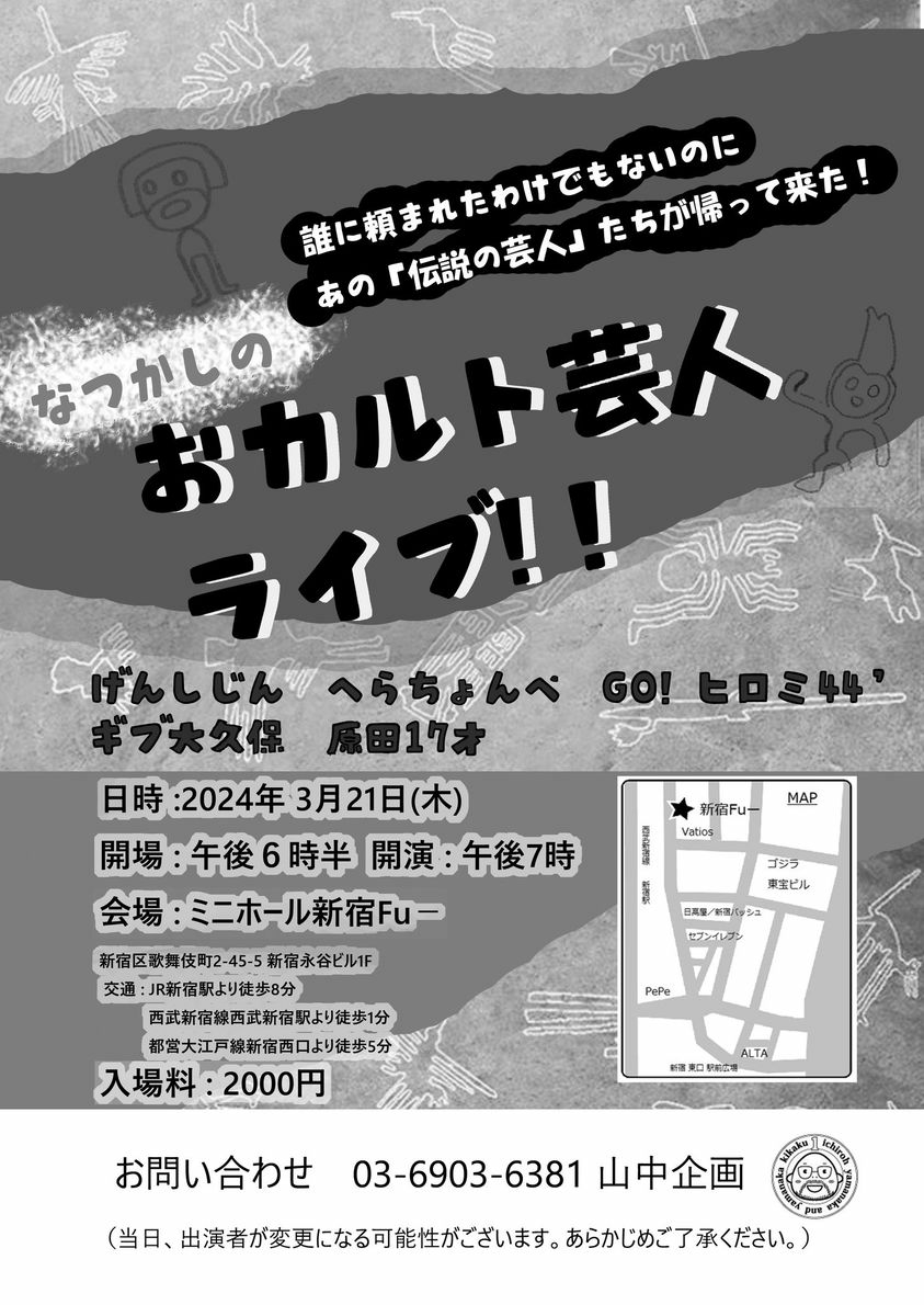 「おカルト芸人」とは何かといえば、いわゆる落語やシャベクリ漫才、テレビでよく見られるコントなどのような「正統派」のお笑いではなく、どこか「邪道」というか、「異端」というか、脇道に逸れちゃった匂いを感じさせる芸人のこと。売れてる芸人だと江頭2:50とかがそれにあたる。今回来てもらうのは30年以上、そうした芸風を貫いていて、しかも「売れている」状態にはない面々。「なつかしの」としたのは、だからその長いキャリアに敬意を評した意味合いもある。